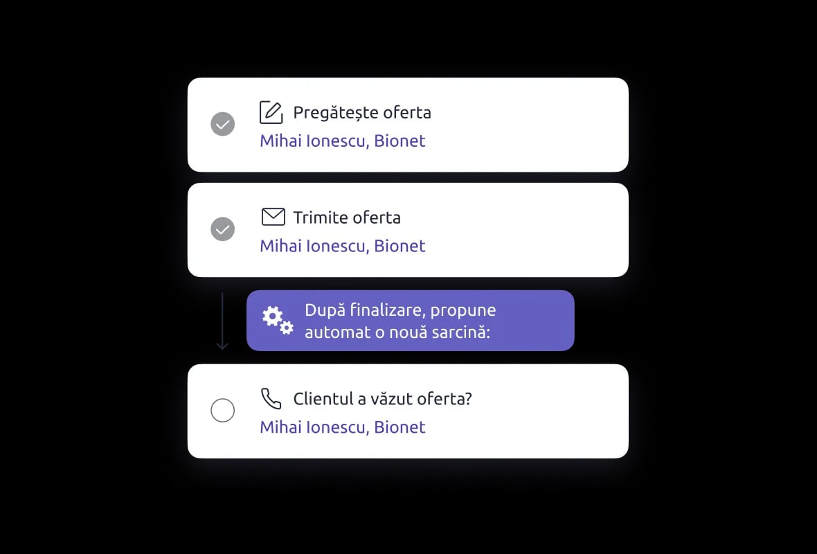 Setează o singură dată o secvență de acțiuni, iar CRM-ul va adăuga automat următoarele sarcini după schimbarea etapei, va reaminti despre contact și va sugera ce urmează.
